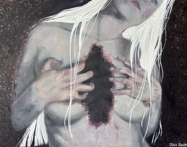 Love promises fulfillment, yet it also exposes us to pain, especially if you seek out toxic partners because that is what you know and what you think you deserve. The woman in my piece is trying to piece back together a gaping hole in her chest, but the wound keeps getting reopened as she experiences more pain within repeated dysfunctional relationships.