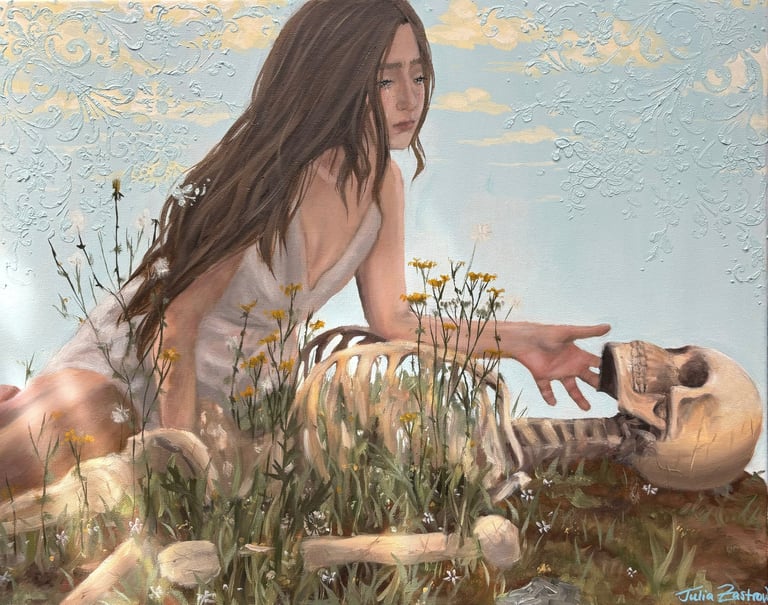 This painting explores the final stage in the cycle of life. A young woman kneels beside a skeleton that has been reclaimed by nature, reaching out towards her loved one, with a tear trailing down her cheek. She wrestles with the ache of letting go. Death, even though painful, is essential to the flow of the world and inevitable.