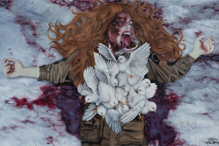 This painting reflects the ongoing toll of war, showing how humanity continues to suffer as we repeatedly choose to engage in it. A young soldier lies in a stigmata position in blood-stained snow, sacrificed for causes beyond him, innocence lost and life cut short. Doves escape his chest, symbols of peace betrayed by war’s false promises. The Ouroboros patch on his uniform marks the endless cycle: war breeding more war.